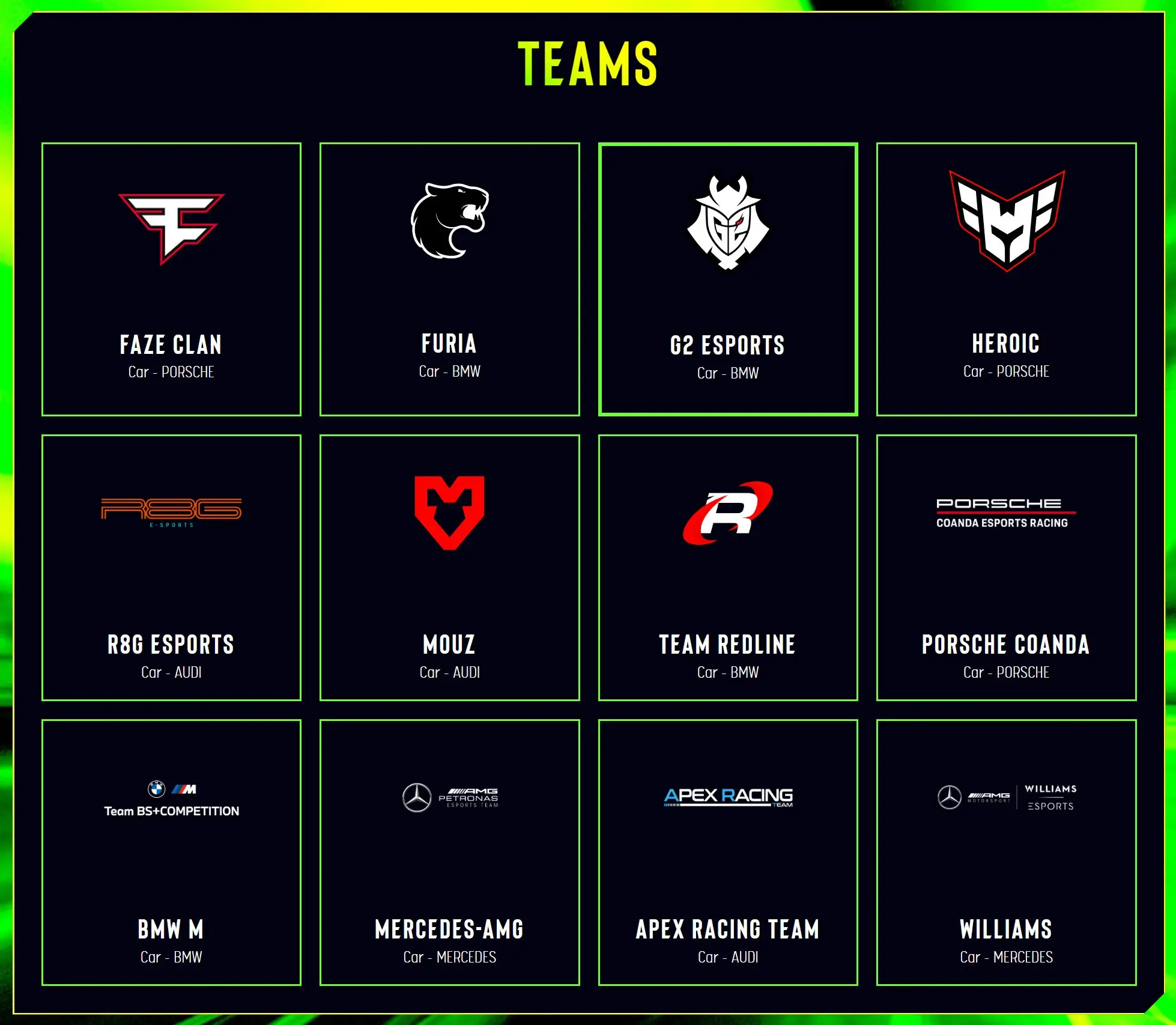 The first spring season kicked off with a bang at the free-to-enter IEM Expo, a part of Intel® Extreme Masters (IEM) Katowice, on February 10-12 2023. In the event participated 8 partner teams and 4 wild card teams, including G2 Esports, Mouz, Porsche Coanda, BMW W, Mercedes-AMG, Apex Racing Team, and Williams among others.
