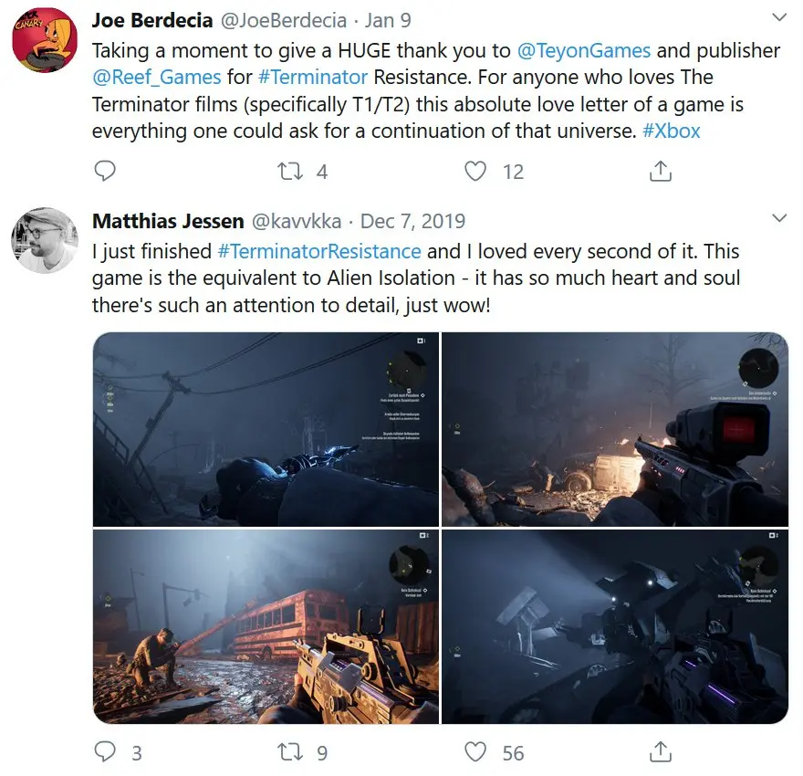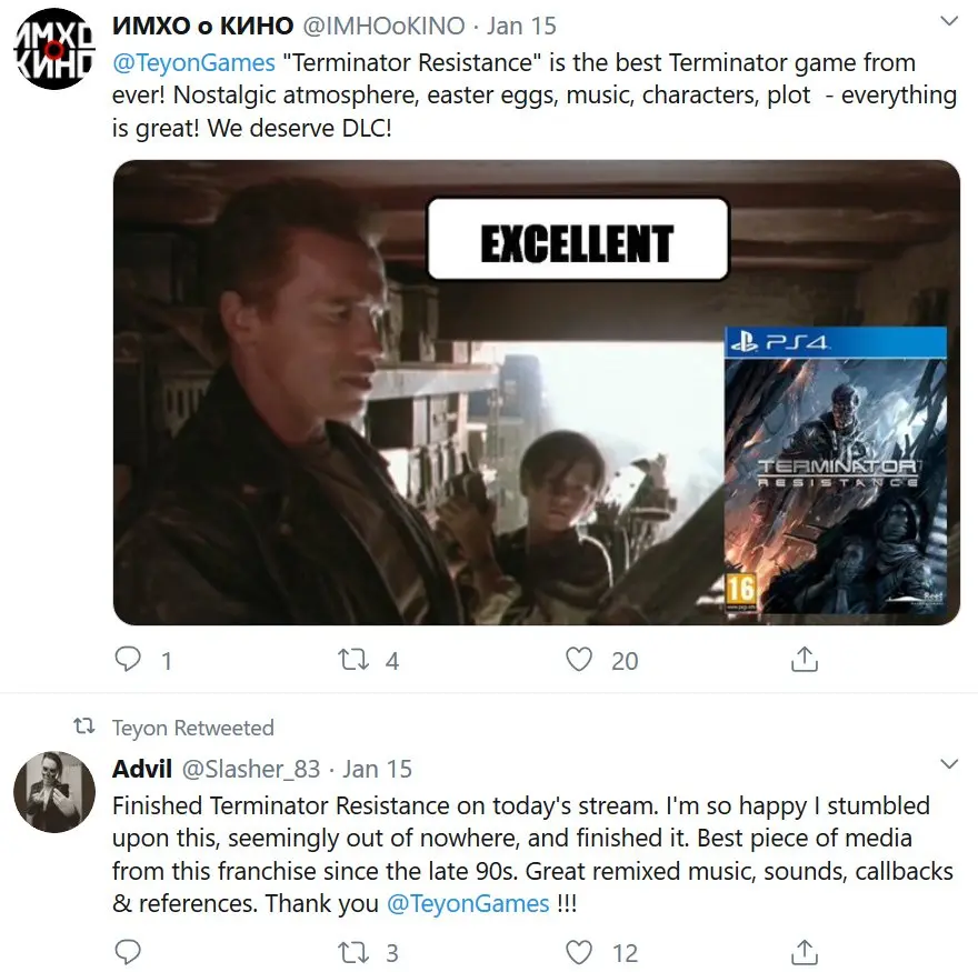 Gamers' feedback about Terminator Resistance has been so overwhelming! 93% (over 2 300!) of the user reviews on Steam are positive as of today! The average rating is 4.4 on PS4 and 4.3 on Xbox One. We are very grateful for each positive review posted on Steam, in PSN Store, Xbox Store and online. Let's take a look at some of them.