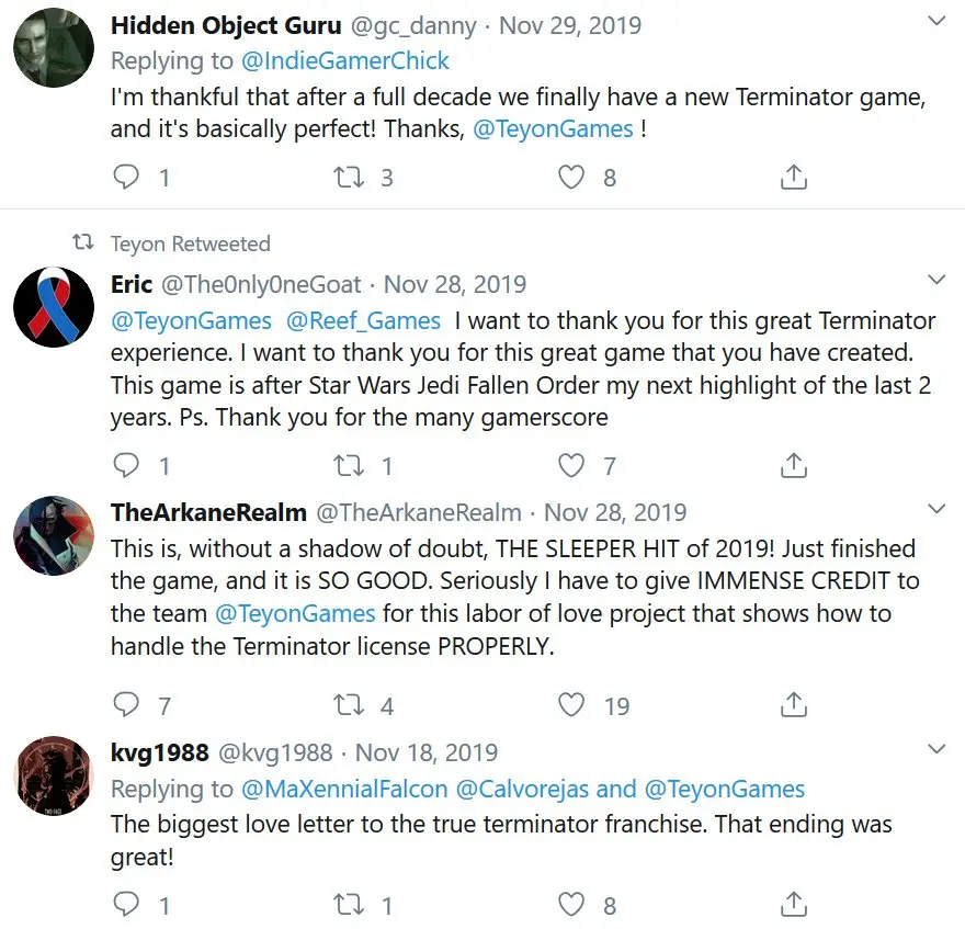 "Even with some of its flaws, it's one of my favorite games I played this year and I want to extend a sincere thank you to the creators for giving us this gem. Teyon and Reef Entertainment have jumped up several levels of quality with this release and I look forward to any future projects they are working on. I absolutely love this game as it is and if you're big into Terminator lore like I am, it's a no-brainer to purchase."