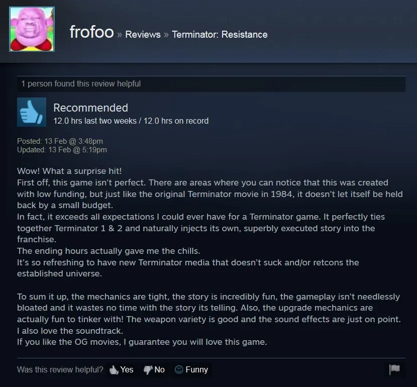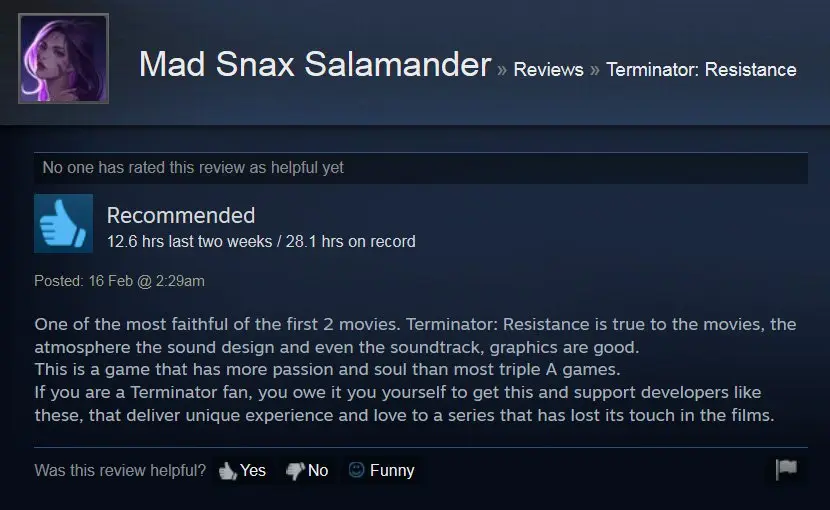 "It was clearly made with love and passion for the source material and isn’t just another licensed cash-grab. I highly recommend this game to anyone, who at the very least, appreciates the James Cameron Terminator films".